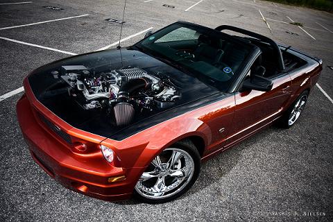 Foose #41 CV Owner: Stevens This Foose Stallion started out as a Black GT and was transformed into the beauty seen here by Unique Performance in December 2006. The result is a stunning Black with Hot Hues Cinnamon. This car was purchased new in Cary, NC in Oct 2008 where the car had numerous upgrades before it left the dealer. These included the Ford Racing Performance Parts (FRPP) Whipple Supercharger, FRPP Hot Rod Cams, FRPP Ceramic Coated Shorty Headers, FRPP Chrome Valve Covers and a Speed Of Sound Dash Pod loaded with the Nexus Series Gauges (Wideband AFM, Vac/Boost, Fuel Pressure). |